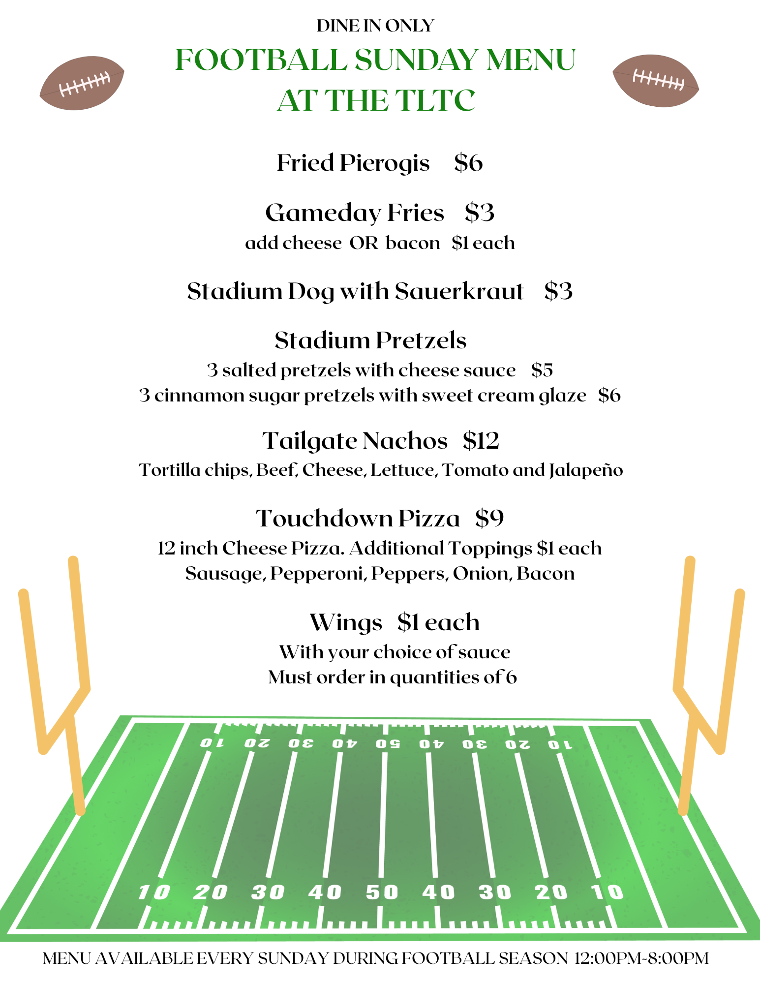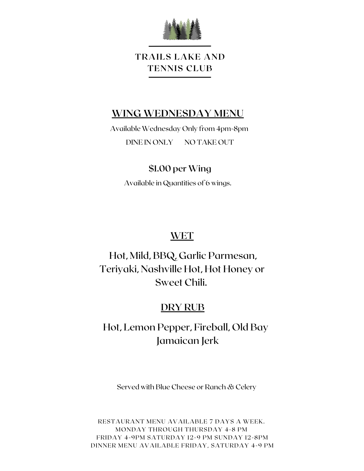 Please note that the kitchen will be closed on Mondays until further notice. See our Crockpot Monday menu for our Monday offerings.