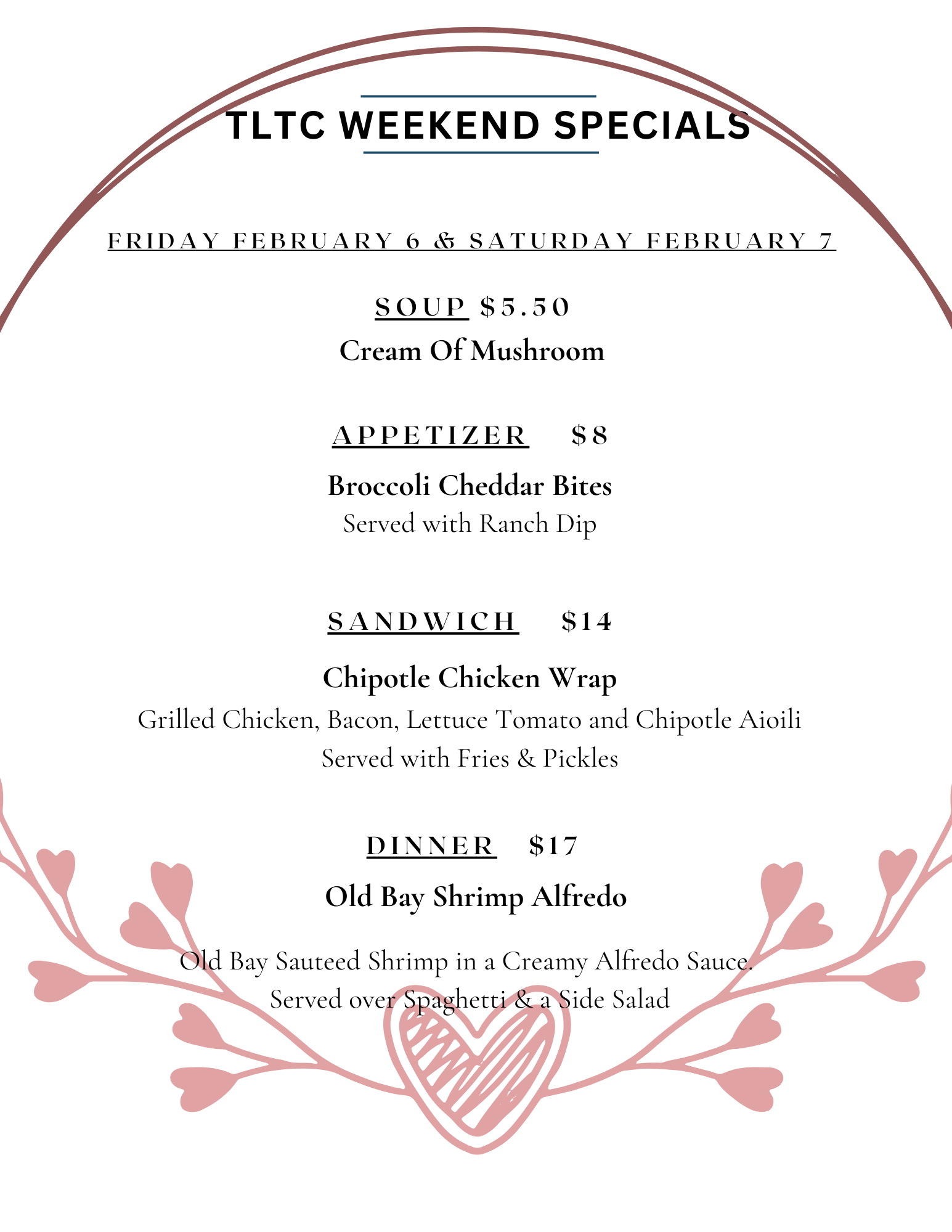 Valentine's Day Dinner Menu is out. Going to be a great night for some delicious food and enjoy the Entertainment. Come check it out.